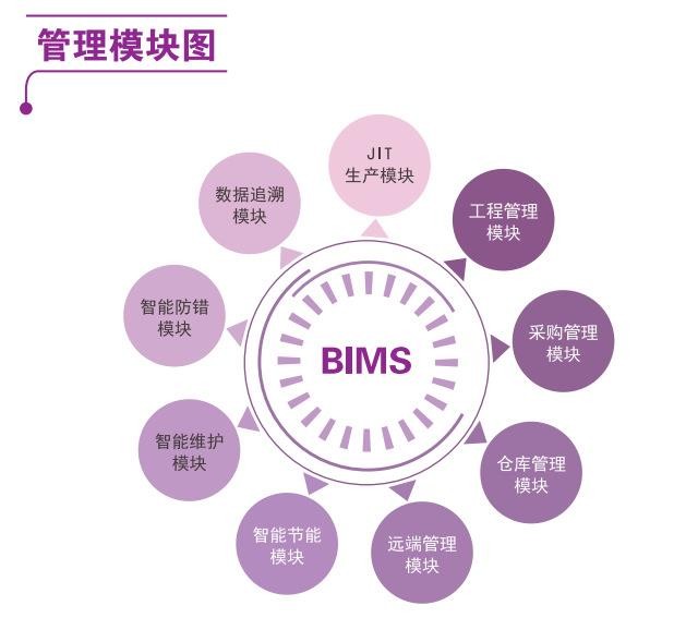 BIMS系統(tǒng)以模塊化的方式提供了一系列獨(dú)特的管理工具及方法,可重構(gòu)生產(chǎn)管理系統(tǒng)或制造執(zhí)行系統(tǒng)。自主研發(fā)的快速重構(gòu)機(jī)制,可根據(jù)客戶業(yè)務(wù)需求,系統(tǒng)各模塊可靈活組裝并深度定制。可快速添加新功能,使BIMS系統(tǒng)更好的延展。從基本功能架構(gòu)上看,BIMS系統(tǒng)的主要功能包括:JIT生產(chǎn)、數(shù)據(jù)追溯。智能防錯、智能維護(hù)、智能節(jié)能、遠(yuǎn)端管理、倉庫管理、采購管理和工程管理。實(shí)際的客戶系統(tǒng)詳細(xì)功能因需定制,與標(biāo)準(zhǔn)的功能架構(gòu)有所偏差。