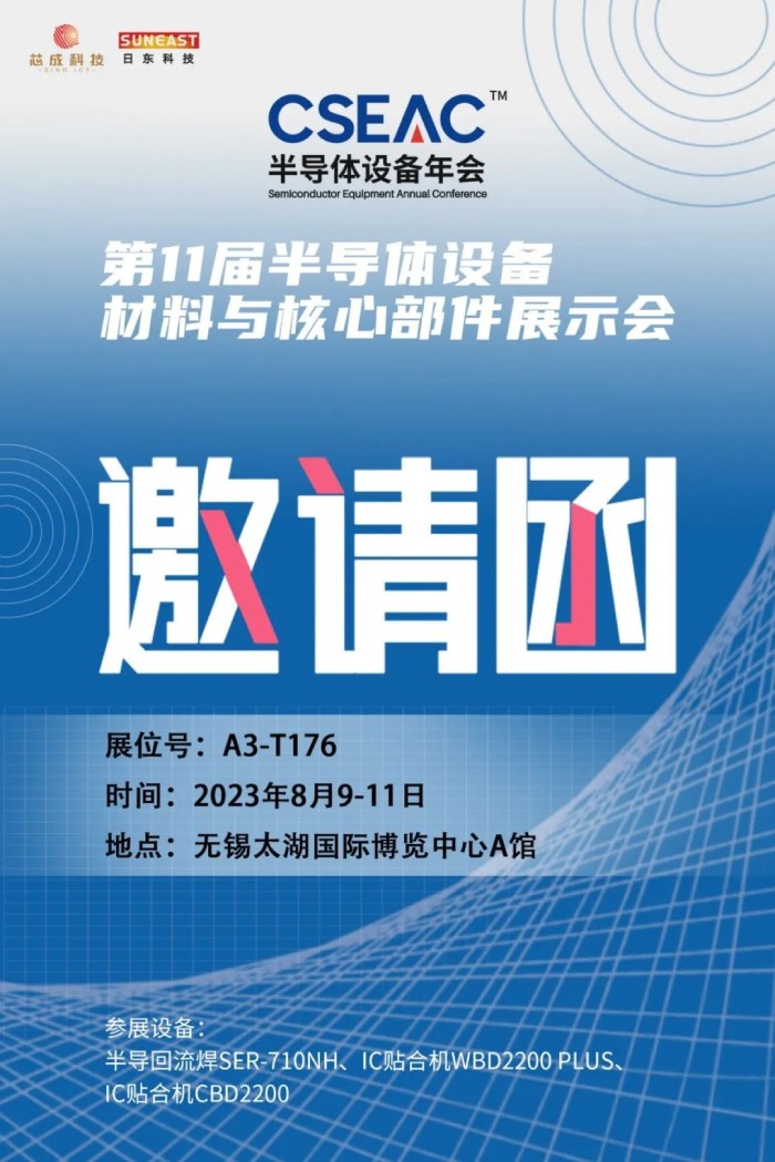 日東科技受邀參加本屆展會(huì),將展出半導(dǎo)體專用回流焊、半導(dǎo)體封裝設(shè)備“IC貼合機(jī)”,并在8月10日上午的專題活動(dòng):新品發(fā)布專場(chǎng),進(jìn)行IC貼合機(jī)的新產(chǎn)品發(fā)布,歡迎您蒞臨日東展臺(tái)和新品發(fā)布會(huì)場(chǎng),與我們面對(duì)面溝通交流!