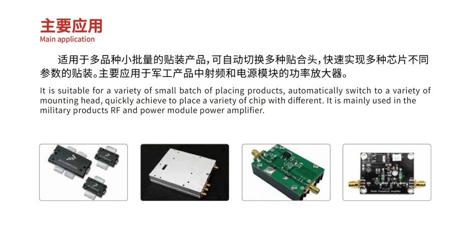 專(zhuān)用型高精度固晶貼合機(jī),適用于多品種小批量的貼裝產(chǎn)品,可自動(dòng)切換多種貼合頭,快速實(shí)現(xiàn)多種芯片不同參數(shù)的貼裝。主要應(yīng)用于軍工產(chǎn)品中射頻和電源模塊的功率放大器。