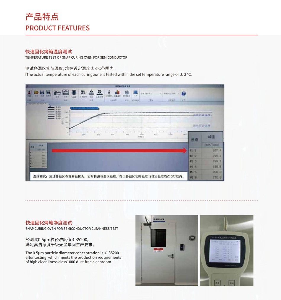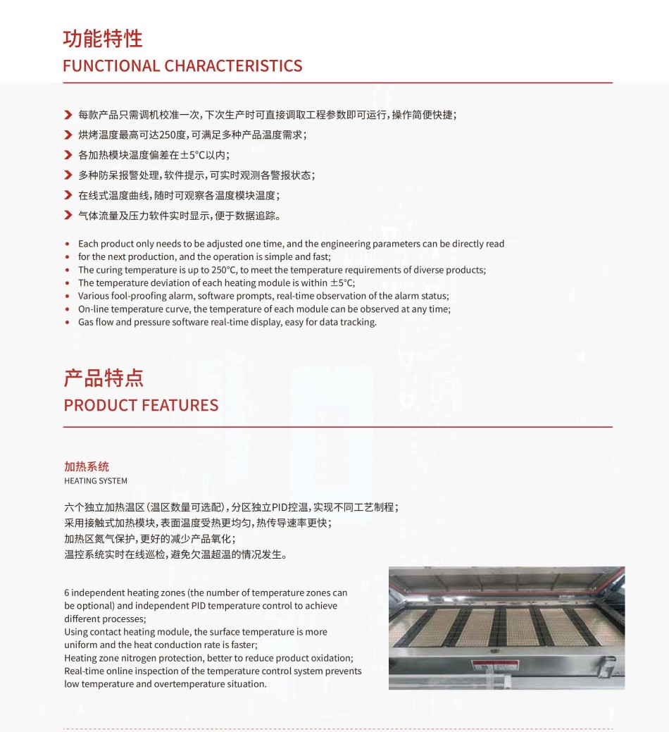 烘烤溫度最高可達(dá)250度,可滿足多種產(chǎn)品溫度需求;各加熱模塊溫度偏差在±5°C以內(nèi);