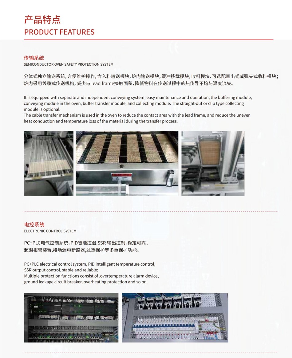加熱系統(tǒng):配置六個溫區(qū),各溫區(qū)溫度可單獨設(shè)置,引線框架單行矩陣排列烘烤。