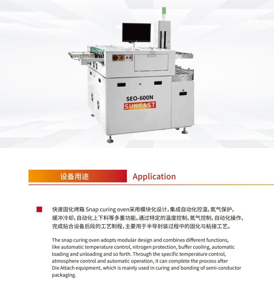 快速固化烤箱SE0-600N采用模塊化設(shè)計,集成自動化控溫,氮氣保護(hù),緩沖冷卻,自動化上下料等多重功能。通過特定的溫度控制,氮氣控制,自動化操作,完成貼合設(shè)備后段的工藝制程,主要用于半導(dǎo)封裝過程中的固化與粘接工藝。